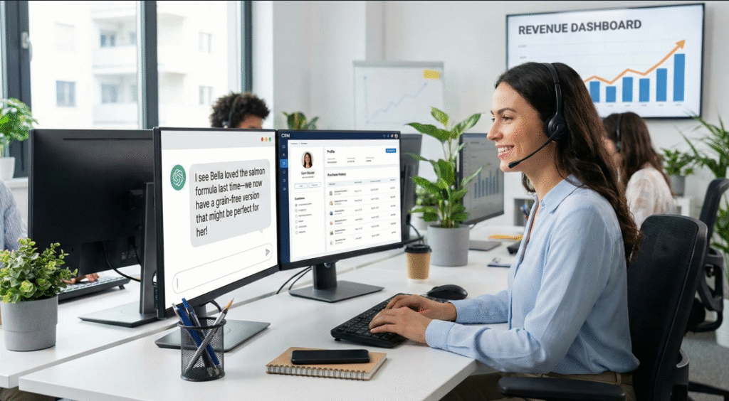 Revenue Example: A specialty pet food store connected their AI chat to purchase history. When customers asked questions, the bot would say: “I see Bella loved the salmon formula last time—we now have a grain-free version that might be perfect for her!” This turned customer service into a revenue generator, adding $8,000 in monthly sales from chat recommendations alone.